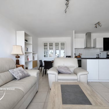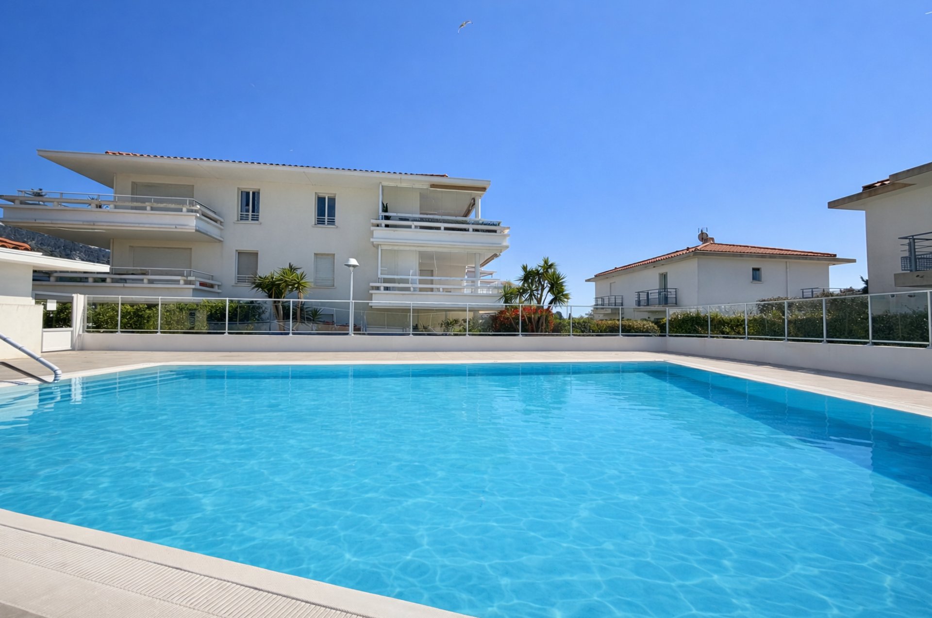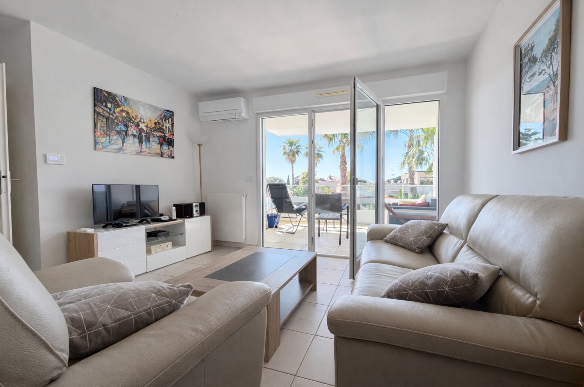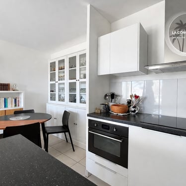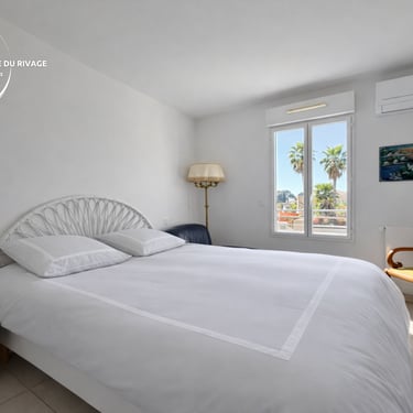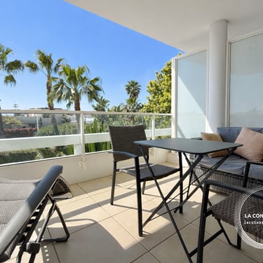 Avec une belle terrasse ensoleillée avec vue dégagée sur les palmiers jusqu'à la mer. Séjour lumineux, cuisine équipée et stationnement privé en sous-sol.