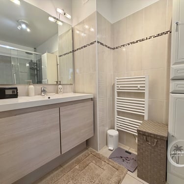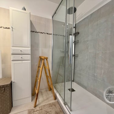 - Salle d’eau avec douche, lavabo et rangements.