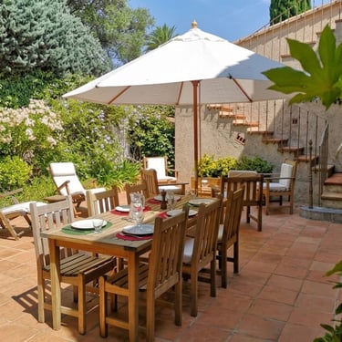 - Une terrasse dominant les jardins, avec un coin salon et un coin repas avec table et chaises… Idéal les journées ensoleillées d'hiver, en mi-saison, ou l'été à la fraîche pour y dîner.