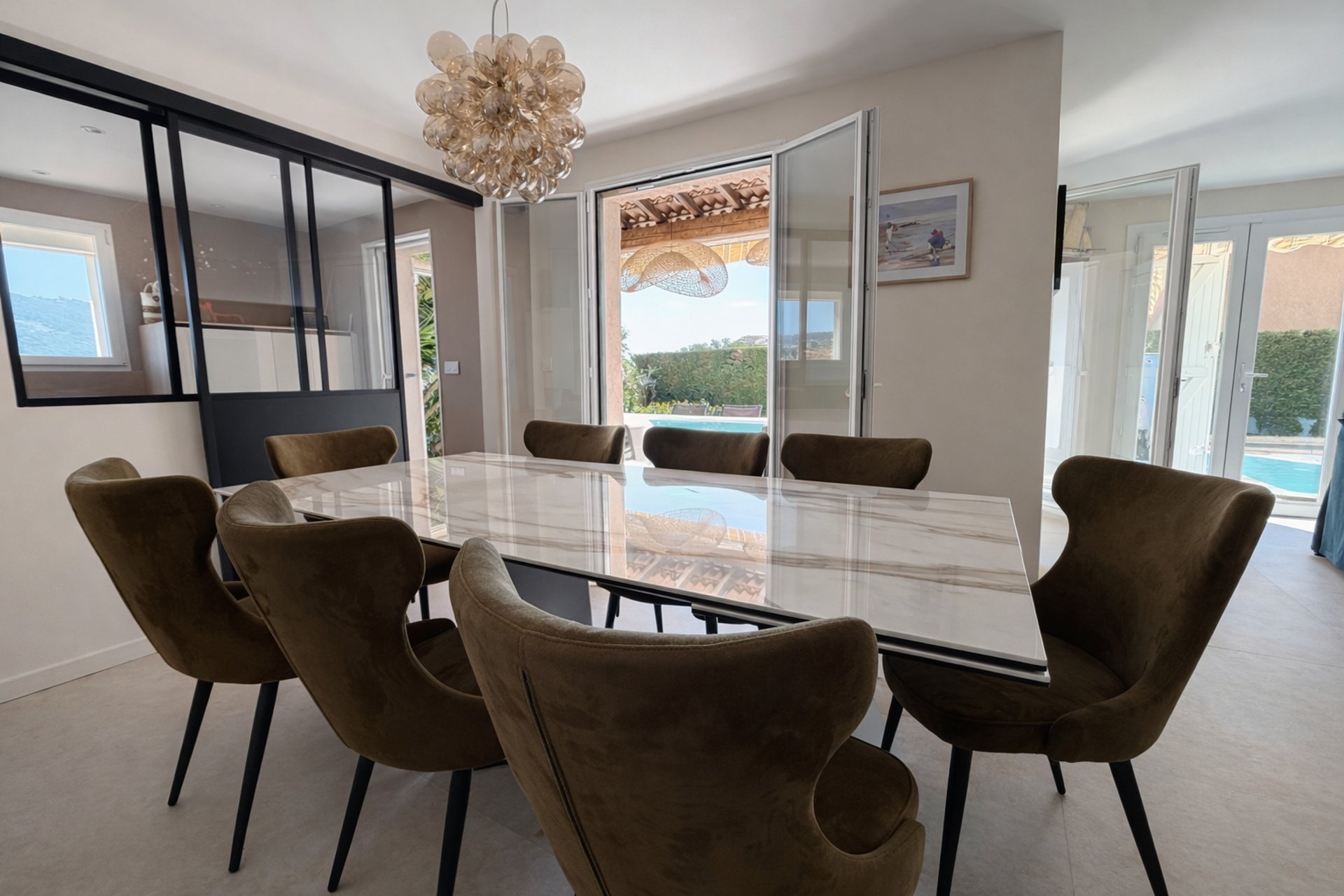 - Salon séjour climatisé avec canapé lit sur lequel il est possible pour une 8ème personne de dormir, TV et box pour la connexion internet wifi dans tout le logement (fibre).