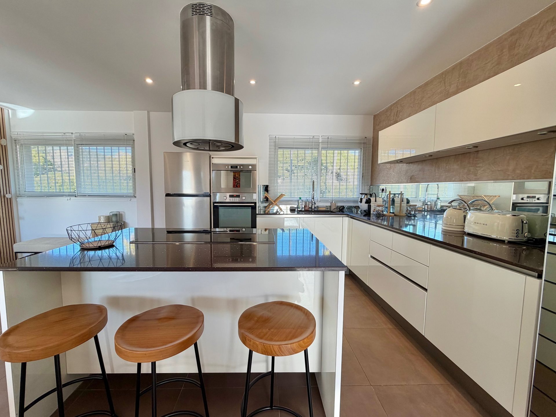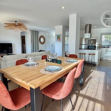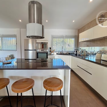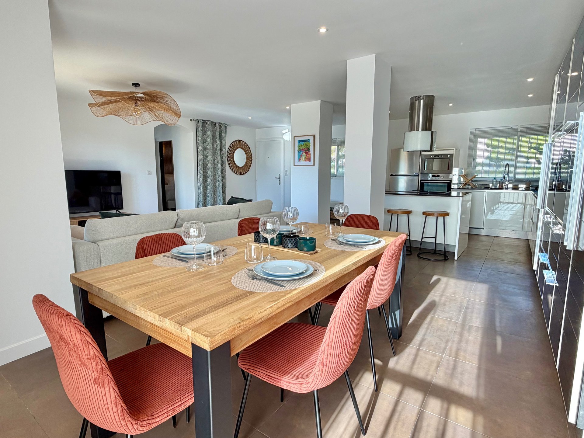 - Cuisine ouverte entièrement équipée : four, micro-ondes, plaques de cuisson, hotte, lave-vaisselle, réfrigérateur-congélateur, cafetière Nespresso, bouilloire, grille-pain, presse-agrumes…