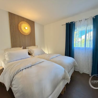 - Chambre 2 : soit 2 lits simples (90 cm), soit un lit double (180 cm), selon la configuration souhaitée. Rangements présents.
