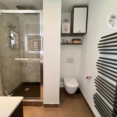 - Salle d’eau moderne et grande douche avec jets massants intégrés.