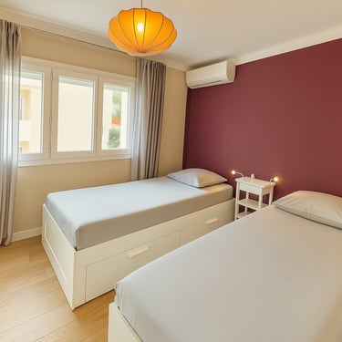 L’appartement est au 1er étage de la résidence et comporte 2 chambres : une chambre double avec un lit 180cm et une deuxième chambre avec 2 lits simples 90cm. Des rangements sont disponibles dans chaque chambre (armoires et coffres de lit).