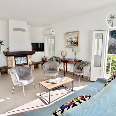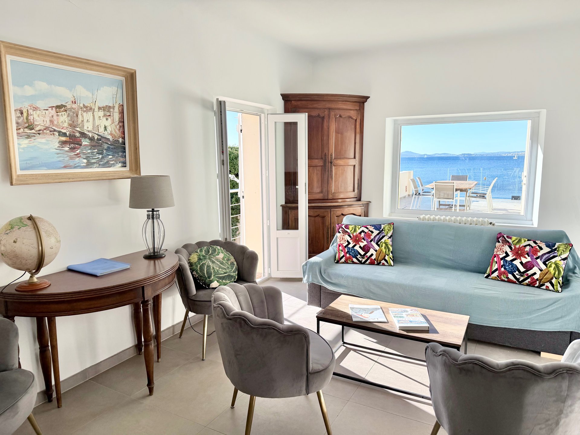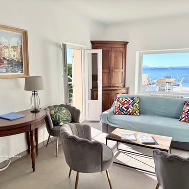 - Troisième salon-séjour climatisé avec canapé-lit (160 cm), TV et accès à une grande terrasse bénéficiant d’une superbe vue sur la mer et la plage.