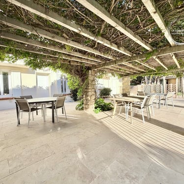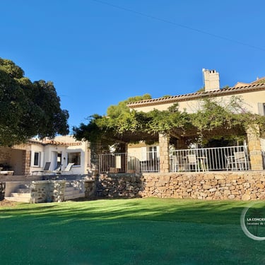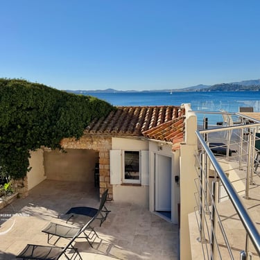 - Plusieurs terrasses aménagées dont une terrasse à l’étage avec vue panoramique sur la mer et sur la baie du Pradet.
