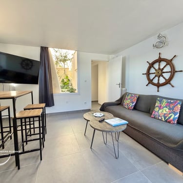 - Deux salons-séjours climatisés, chacun avec canapé-lit (160 cm), TV, espace repas et accès direct vers l’extérieur.